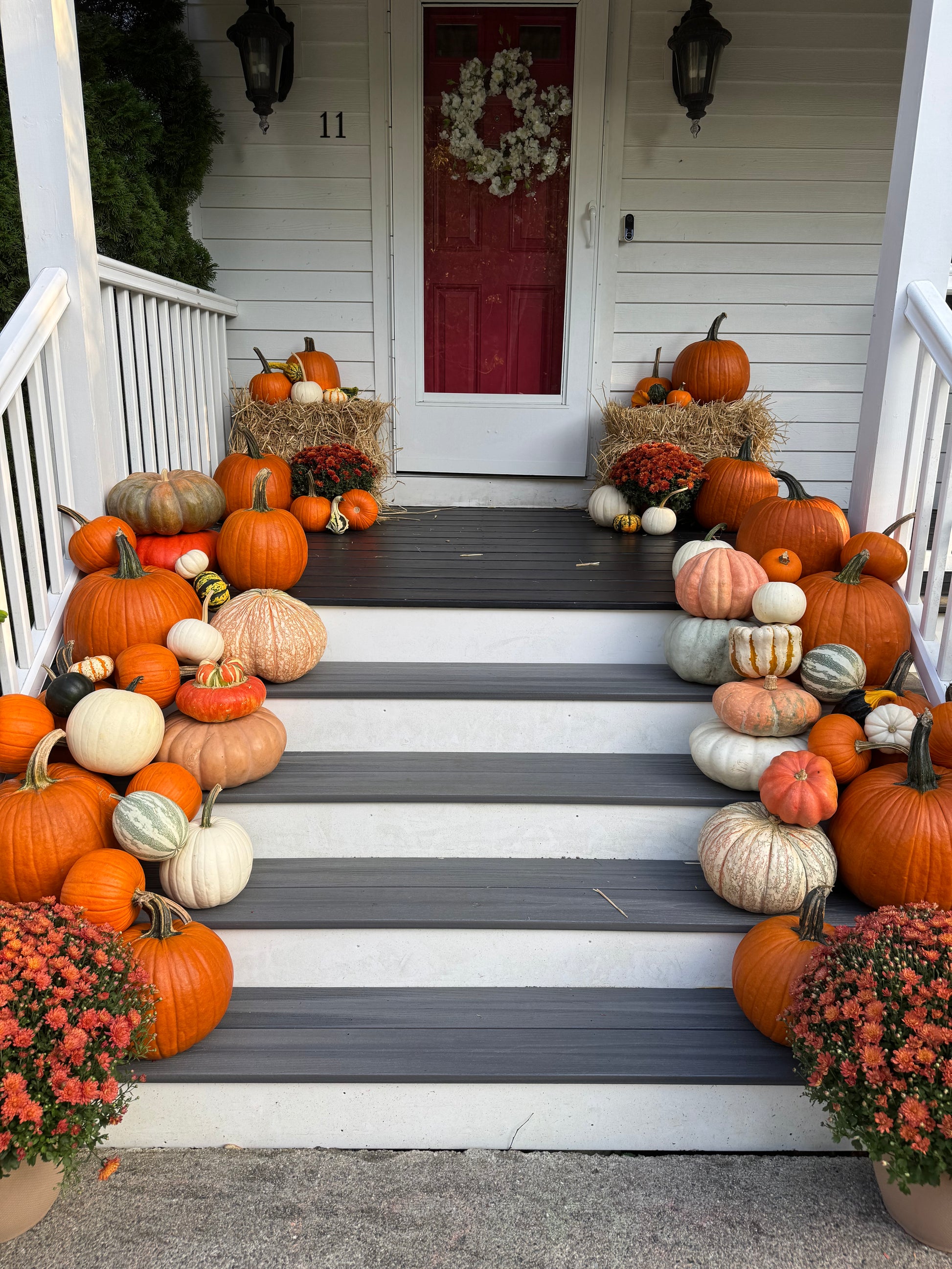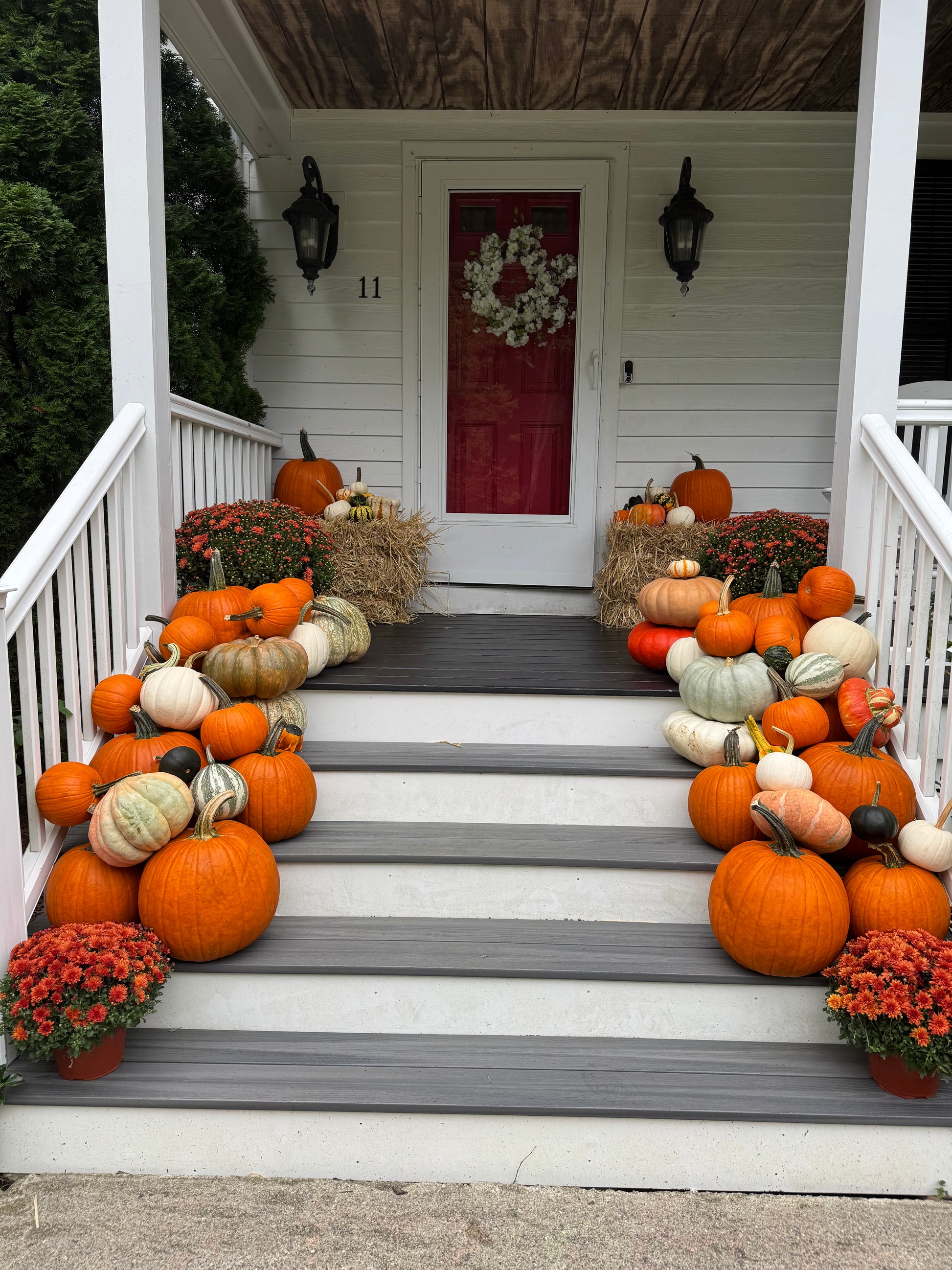 Our biggest and most popular option. The Luxe Showstopper is a bold, colorful display that transforms your entry into a true fall scene. Stacks of specialty pumpkins, large and medium jack-o-lanterns, white pumpkins, pie pumpkins, gourds sprinkled throughout, and two hay bales bring depth, variety, and festive charm. Includes design and professional setup.